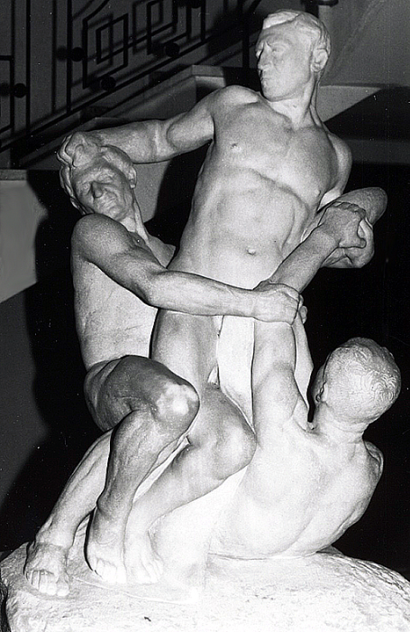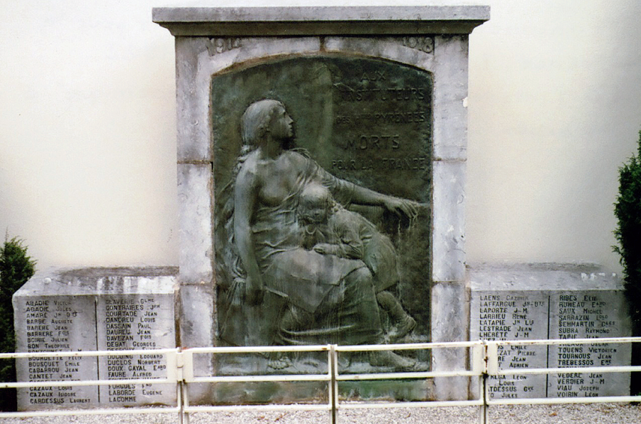 Puis, c’est l’hommage à Hector Berlioz. Enveloppé dans son manteau, il semble se concentrer sur un arpège rebondissant à l’infini. Haut de 2,43 m, le marbre est commandé par l’État, en juillet 1913, et attribué à la ville de Montbrison sur Loire pour la somme de 8000 F. Au salon de 1914, il expose « La lutte pour la vie » commandée par l’État en 1912. L’entrelacement des membres, la tension des muscles, l’expression farouche et les douloureux efforts de trois hommes tendus vers l’indispensable nourriture, révèlent une science de l’anatomie proche de « L’enlèvement des Sabines » de Jean de Bologne. Image prémonitoire, sans doute, de la haine de l’homme pour l’homme qui allait se déchaîner bientôt. Son cœur de patriote saigne à la lecture des communiqués. La frivolité des salons parisiens ne lui est plus supportable. Durant quatre années, il suivra la trajectoire incertaine de nos armées et les sacrifices héroïques consentis pour la défense du sol sacré. Au début de 1918, il réalise un médaillon de son élève tarbais Léon Dufrène tombé au champ d’honneur en conduisant ses hommes à l’assaut de la cote 304, devant Verdun.